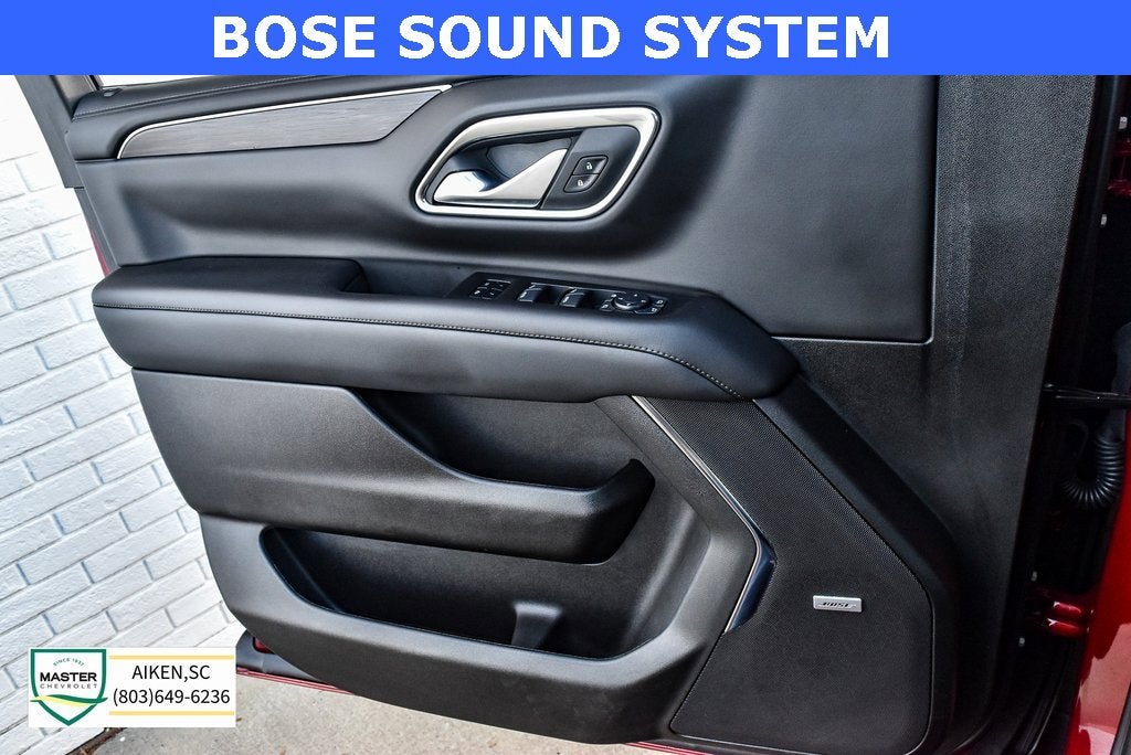 This vehicle is located at Master Chevrolet Cadillac in Aiken, SC! It is equipped with Advanced Trailering Package (Hitch View w/Pan/Zoom Image Adjustment, Integrated Trailer Brake Controller, and Smart Trailer Integration Indicator), Driver Alert Package (Lane Change Alert w/Side Blind Zone Alert and Rear Cross Traffic Alert), Luxury Package (2nd Row Pwr Release 60/40 Split-Folding Bench Seat, 3rd Row 60/40 Power-Folding Split-Bench Seat, HD Surround Vision, Heated 2nd Row Outboard Seats, Heated Steering Wheel, Memory Settings, Outside Heated Power-Adjustable Mirrors, Power Tilt & Telescopic Steering Column, and Rear Pedestrian Alert), Max Trailering Package (Extra Capacity Cooling System), Preferred Equipment Group 2Z7 (1st & 2nd Row Color-Keyed Carpeted Floor Mats, 2-Speed Active Electronic AutoTrac Transfer Case, Auto-Dimming Inside Rear-View Mirror, Black Tubular Assist Steps, Bose 9-Speaker Stereo Audio System Feature, Bright Front & Rear Door Sill Plates, Color-Keyed Carpeting Floor Covering, Driver & Front Outboard Passenger Airbags, Enhanced Driver Information Center, Floor Console w/Storage Area, Front High-Approach Angle Fascia, Hands-Free Rear Power Programmable Liftgate, Hill Descent Control, LED Daytime Running Lamps, Memory Settings for Driver, Red Horizontal-Mounted Recovery Hooks, Remote Start, SiriusXM w/360L, Universal Home Remote, Wireless Charging, and Wrapped Steering Wheel), 10-Way Power Driver & Passenger Seat Adjusters, 1st, 2nd & 3rd Rows All-Weather Floor Liners (LPO), 3.23 Rear Axle Ratio, 3rd row seats: split-bench, 4-Wheel Disc Brakes, 9 Speakers, ABS brakes, Air Conditioning, Alloy wheels, AM/FM radio: SiriusXM with 360L, Apple CarPlay/Android Auto, Auto High-beam Headlights, Auto-dimming Rear-View mirror, Automatic temperature control, Brake assist, Bumpers: body-color, Compass, Delay-off headlights, Driver door bin, Driver vanity mirror, Dual front impact airbags, Dual front side impact airbags, Dual-Pane Power Panoramic Sunroof, Electronic Stability Control, Emergency communication system: OnStar and Chevrolet connected services capable, Four wheel independent suspension, Front anti-roll bar, Front Bucket Seats, Front Center Armrest, Front dual zone A/C, Front High-Back Reclining Bucket Seats, Front reading lights, Fully automatic headlights, Garage door transmitter, Heated door mirrors, Heated Driver & Front Passenger Seats, Heated front seats, Illuminated entry, Infotainment Display, Leather-Appointed Seat Trim, Low tire pressure warning, Memory seat, Navigation System, Occupant sensing airbag, Outside temperature display, Overhead airbag, Overhead console, Panic alarm, Passenger door bin, Passenger vanity mirror, Power door mirrors, Power driver seat, Power Liftgate, Power passenger seat, Power Release 2nd Row Bucket Seats, Power steering, Power windows, Premium audio system: Chevrolet Infotainment 3 Premium, Premium Smooth Ride Suspension, Radio: Chevrolet Infotainment 3 Premium System, Rain sensing wipers, Rear air conditioning, Rear anti-roll bar, Rear reading lights, Rear seat center armrest, Rear window defroster, Rear window wiper, Remote keyless entry, Roof rack: xxxxxx, Security system, Speed control, Speed-sensing steering, Split folding rear seat, Spoiler, Steering wheel mounted audio controls, Tachometer, Telescoping steering wheel, Tilt steering wheel, Traction control, Trip computer, Variably intermittent wipers, Voltmeter, and Wheels: 20 x 9 Machined Aluminum. Odometer is 11095 miles below market average!